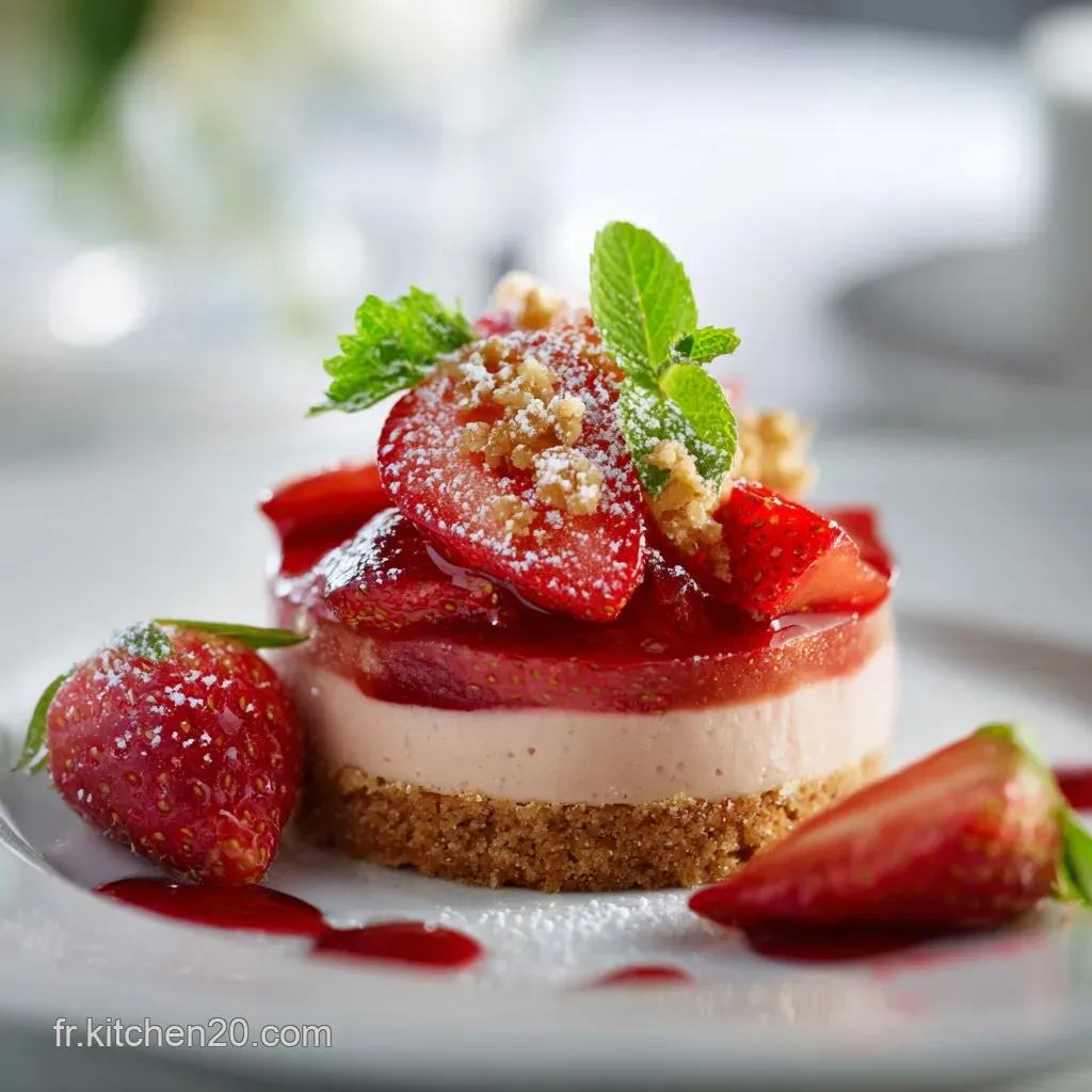 Vous pouvez aussi napper le dessus d'un fin coulis (gelée) de fraise pour une finition brillante, si vous voulez un effet "Cyril Lignac". Le petit plus que j'adore : un léger voile de sucre glace juste avant de servir.
