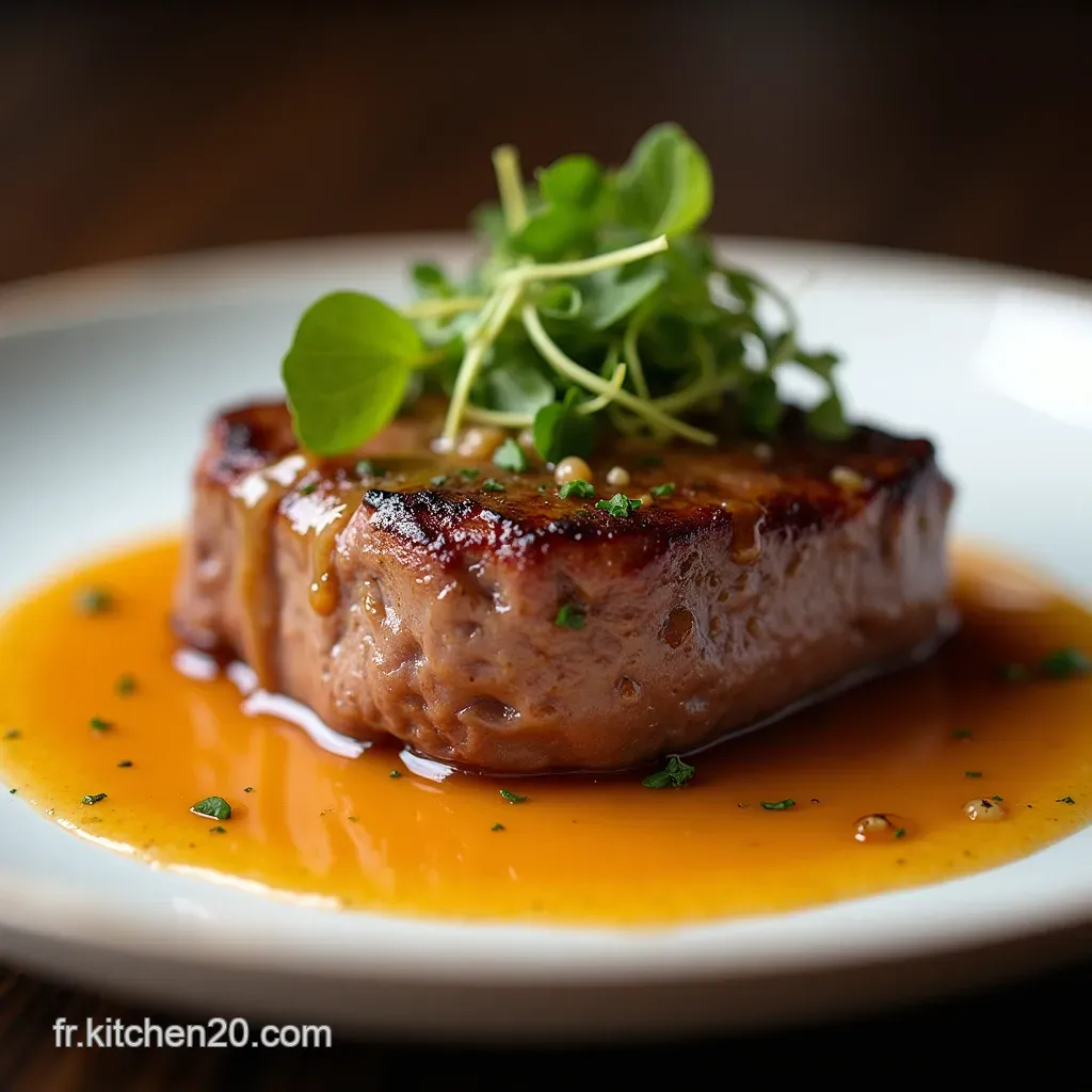 Pour un dressage digne d'un grand restaurant, disposez la tranche de filet mignon au centre de l'assiette. Versez généreusement la Filet Mignon Sauce Moutarde Miel Four sur le dessus, permettant à la sauce de couler légèrement sur les bords.